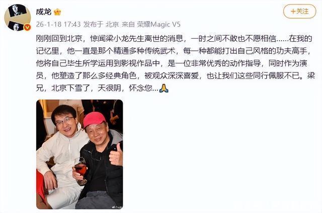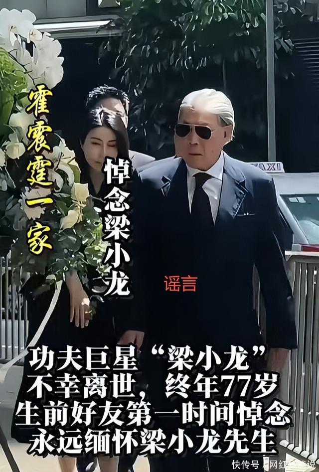 编辑|迟迟 这是梁小龙的徒弟龙武为他写下的挽联,短短十四个字,道出了这位功夫影星人生的高光时刻。 明明2026年才刚开始,名人去世的噩耗就一个接一个传来,先是围棋界的棋圣聂卫平,再到表演艺术家陶玉玲,还有功夫影星梁小龙(终年75岁)。 这位功夫巨星曾因饰演“陈真”一炮而红,他一脚踢碎“东亚病夫”牌匾的形象,曾让无数中国人觉得振奋人心! 而这位常以配角形象示人的老戏骨,始终未曾远离大荧幕,他拍了一辈子的戏,耳边不缺赞美之声,却也沾上了一身非议。 有人因为他与不幸毁容的原配离婚,指责其薄情寡义,也有人因为他“背刺”帮助过自己的周星驰,觉得他忘恩负义。 可是也有人记得,他曾因为带头向祖国表白,而被封杀长达20年,只不过,这一切的争议以及赞美,都随着他的离世而留在了过去。 但让人没想到的是,他的葬礼现场被曝光不到24小时,就出现了极其恶心的一幕,居然有多位名人惨遭牵连! 1月26日的深圳龙岗,迎来了一场特殊的追悼会,梁小龙先生的家人在此为他举行了最后的告别仪式。 跟寻常葬礼所不同的是,他的家人准备了两个灵堂,一个专门接待亲戚朋友,另一个则是为万千影迷准备的。 放眼香港演艺圈,尽管梁小龙的名气算不上一线,但他仍凭借多个经典角色家喻户晓,所以在他离世的噩耗传出时,很多影迷都深感意外。 本来他的家人不准备把仪式办得太高调,甚至起初他们连这个死讯都不准备公开,但香港媒体的披露打乱了他们的计划。 考虑到梁小龙的影迷遍布全国各地,他们不忍心把这么多影迷拒之门外,又担心现场秩序不好维护,这才准备了两个悼念厅。 在相关报道中大家能看到,灵堂内外人很多,花圈和挽联更多,而送来这些花圈的人,大多是梁小龙的徒弟。 他传授武术数十年,可以说是桃李满天下,很多徒弟都是奔着“陈真”的名头拜师的,不过梁小龙的遗照却不是“陈真”这一经典形象。 这是梁小龙成名的起点,更是他职业生涯的高光时刻,很多观众都是因为这一角色记住了他。 现场还有影迷特意带来了当年的老版录像带,放在了献花处,用以表达对梁小龙的怀念。 而正是在这个献花处,很多人发现了一个令人意外的花篮,上面的落款居然是周星驰! 同为香港影史的标志性人物,周星驰与梁小龙也是颇有渊源,甚至可以说,周星驰算是他的贵人,在低谷期拉了梁小龙一把。 但关于二人的恩怨,也曾在网络上传得沸沸扬扬,甚至有人说,梁小龙背刺了周星驰,两人结过梁子! 或许鲜少有人知道,梁小龙曾在20世纪80年代中后期淡出过镜头,且一消失就是20年。 而这仅仅是因为他在采访中公开表示,自己很挂念大陆,那是他的祖国和根,这番话在那个港星都不敢表明立场的特殊年代,惹怒了某些人。 圈里人开始对他避之不及,梁小龙的戏约一夜之间全黄了,他的演艺生涯被迫按下了暂停键,为了糊口开办武馆,开始带徒弟。 直到周星驰筹拍《功夫》那年,阔别镜头20年的梁小龙,终于凭借“火云邪神”一角重磅回归,可他前脚回归,后脚便传出了流言。 最普遍的说法就是港媒传出来的,称梁小龙因为片酬太少与周星驰闹掰,他拒不承认自己是被周星驰捧红的,甚至暗示自己不会再跟他合作。 要知道,星爷的人气哪怕是今天,依旧是很多演员可望而不可求的,梁小龙的发言一经传出,就引起了很多人的谩骂。 对于其中内情,周星驰也没有过多回应,但不管真相如何,周星驰特意送去花篮悼念,实际上也让两人不和的传言不攻自破。 就算曾经的恩怨再大,也随着逝者的离去而烟消云散了,本以为这已经是梁小龙葬礼上最令人意外的新闻了,不曾想还有人编造假消息,吃人血馒头! 尽管梁小龙在演艺圈不是数一数二的大腕,但他也曾代表了香港功夫片的巅峰期,被誉为“香港四小龙”之一。 他的告别式不说多么值得重视了,尊重应该是最基本的,可就在消息被曝光的同时,一些别有用心的人出现了。 网络上开始传出一些谣言,说什么梁小龙葬礼大咖云集,成龙、霍启刚家族纷纷现身,还晒出一些所谓的现场照片抓人眼球。 成龙大哥同为功夫明星,的确对梁小龙的逝世深表遗憾,他第一时间发文悼念,但并未亲自去葬礼现场。 至于霍启刚家族更是冤枉,这些人把他们之前参加别人葬礼的照片翻出来,故意拼接在一起,当作悼念梁小龙的画面。 这些人编造假消息,只是为了骗取流量关注,纯纯消费逝者,实在是太恶心了,最离谱的是,他们编也能编错。 一些传播甚广的消息,连人家的年龄都没弄清楚,75岁居然写作77岁,也不怕贻笑大方。 或许对这些只想赚钱的人来说,消息真假已经无关紧要,只要能炒出热度连良心都可以不要。 不过,梁小龙的告别式上的确出现了一位“大人物”,他就是曾经与之结拜过的义兄陈惠敏。 此人既是香港知名男演员,参演过不少动作片、功夫片,年轻时还曾混迹于“江湖”,跟香港一些帮派人物关系匪浅,算是他们公认的“大佬”。 陈惠敏已经80岁高龄,他本可以不来这种场合,但为了送别曾经的好兄弟,他拄着拐杖坚持亲临现场。 很多人都拍到他一袭黑衣神情肃穆,身旁还有人搀扶,陈惠敏一把年纪还前来吊唁,这也不难让人相信,梁小龙肯定是个有义气的。 但要是从感情生活上看,他在很多人眼中,却不算是个合格的丈夫! 在鱼龙混杂的演艺圈,梁小龙是众多功夫明星之一,他的业务能力令人称颂,但私下的争议也的确不少。 除了与周星驰的过